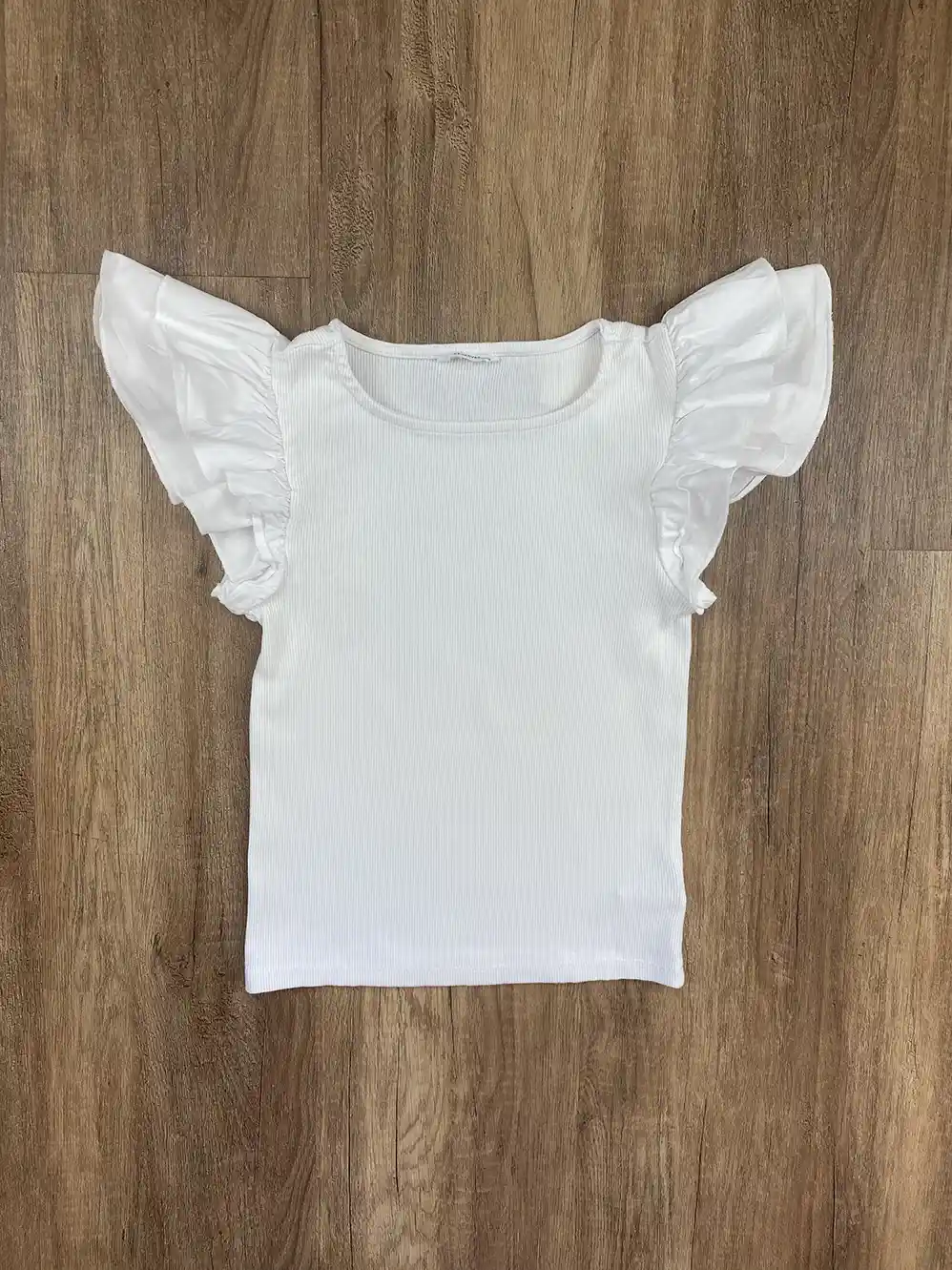 A Termékre jellemző információ: Rövid ujjú, fodros ujjú bordás felső